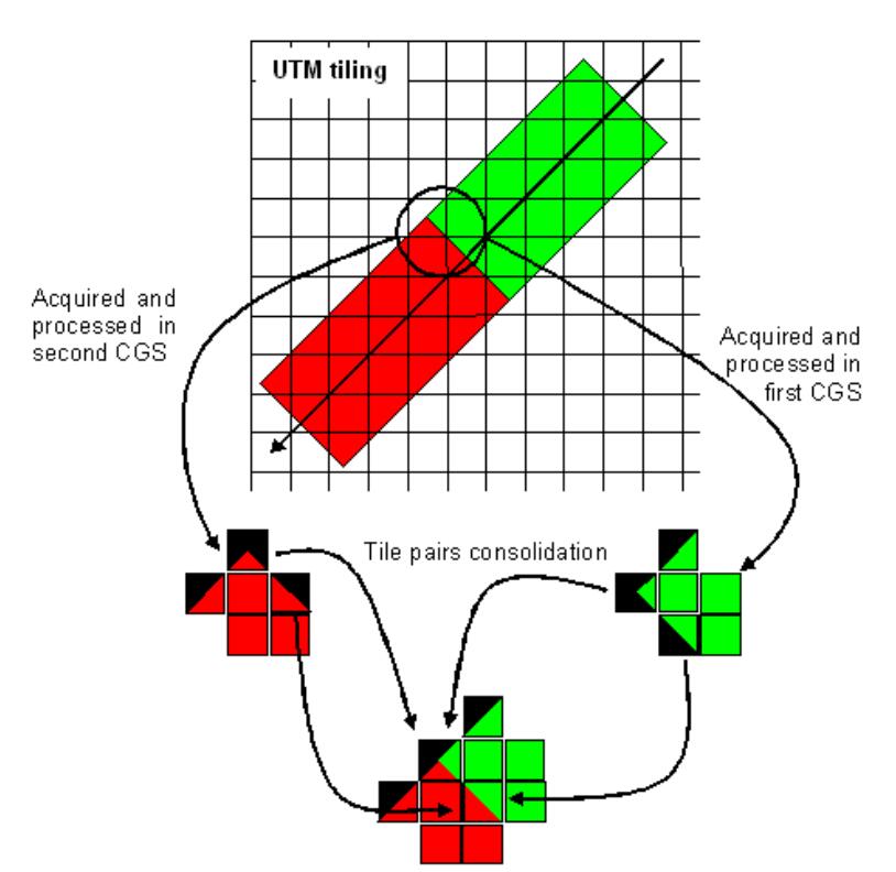 Since datatakes are usually composed of datastrips provided by multiple ground receiving stations (an exception would be if the data is transmitted via a geostationary satellite downlink) one question arises: “how are two adjacent ground stations handled?" The situation is illustrated in the figure below.